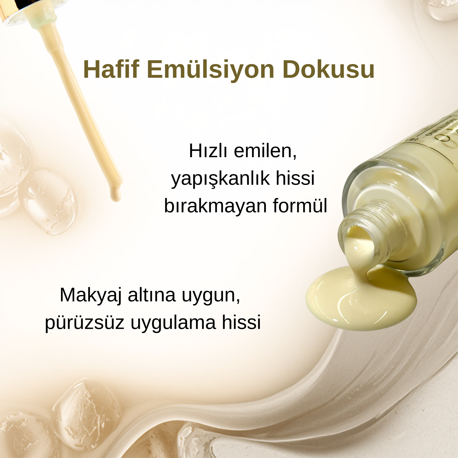 Hafif emülsiyon dokusu sayesinde ciltte ağırlık hissi bırakmaz ve hızlı emilir. Makyaj altına uygun yapısı ile pürüzsüz bir temel oluşturur.