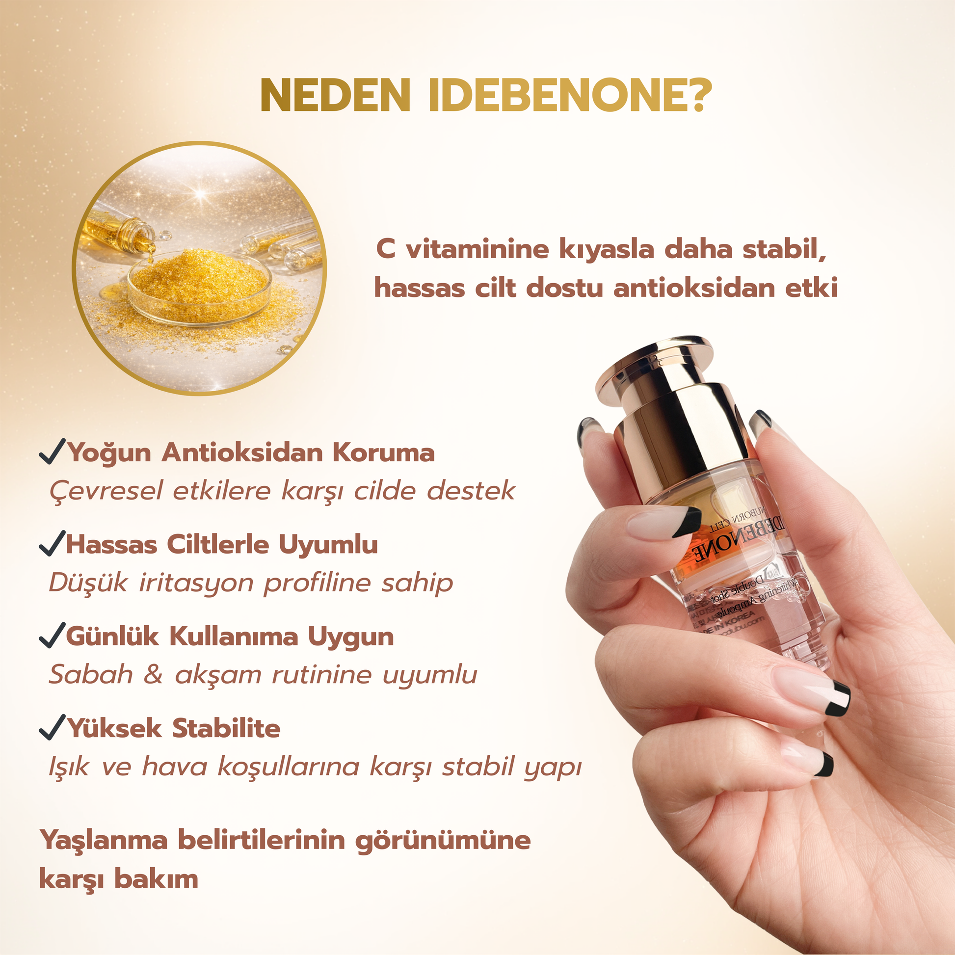 Idebenone (%2,2) içeriğiyle cildinize güçlü bir antioksidan bakım sunar. Kore cilt bakımında önemli bir yere sahip olan bu serum, cilt tonundaki eşitsizlik görünümünün azalmasına yardımcı olurken cildin daha canlı görünmesini destekler.